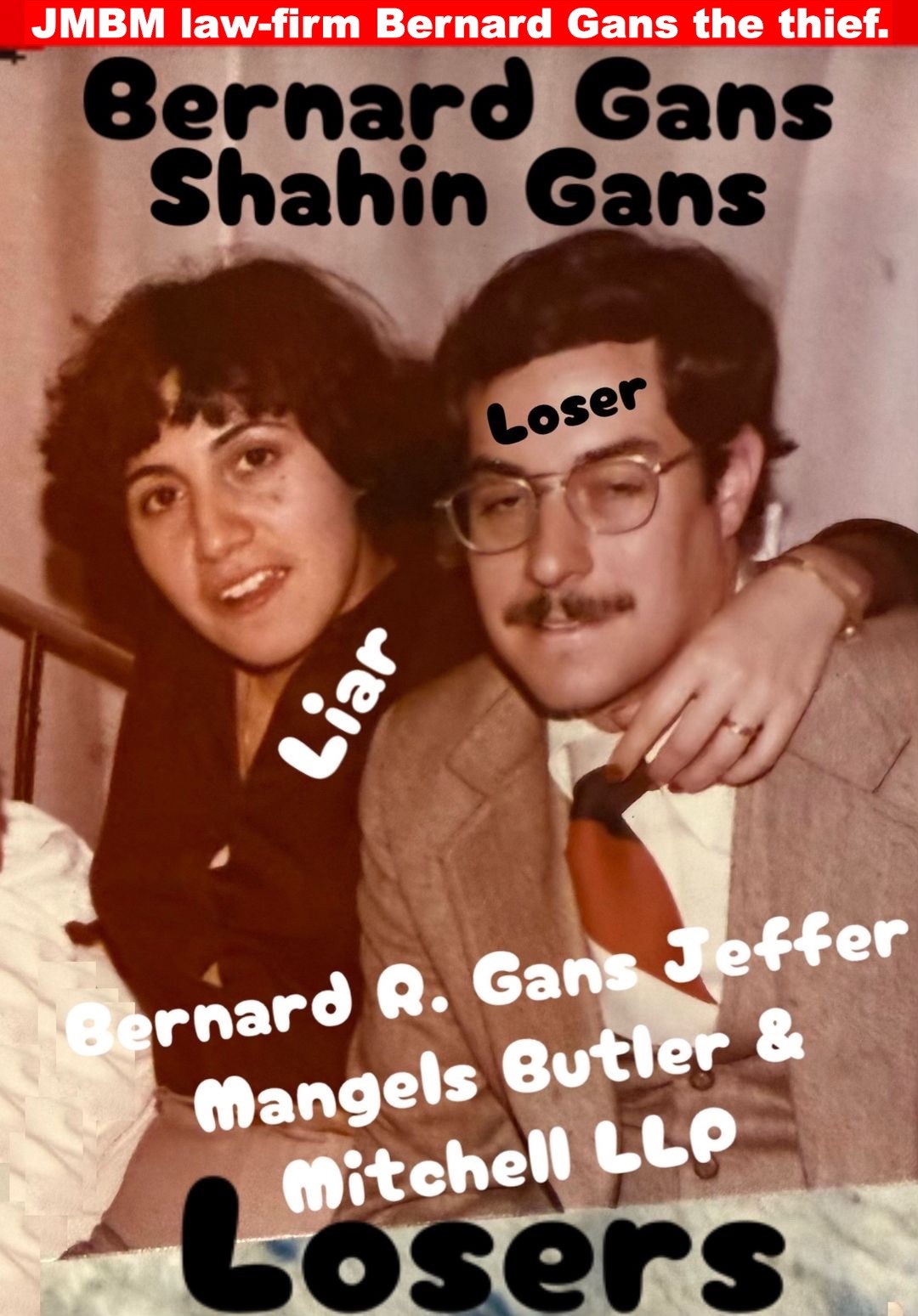Suing JMBM partner $500,000,000,000.00 Busted criminal attorneys Jeffer Mangels Butler & Mitchell LLP lawyer Bernard Reginald Gans #57068 Bernard Gans Mina Sirkin law group JMBM killed my mom to get her fortune.Suing JMBM partner $500,000,000,000.00 Busted criminal attorneys Jeffer Mangels Butler & Mitchell LLP lawyer Bernard Reginald Gans #57068 Bernard Gans Mina Sirkin law group JMBM killed my mom to get her fortune.