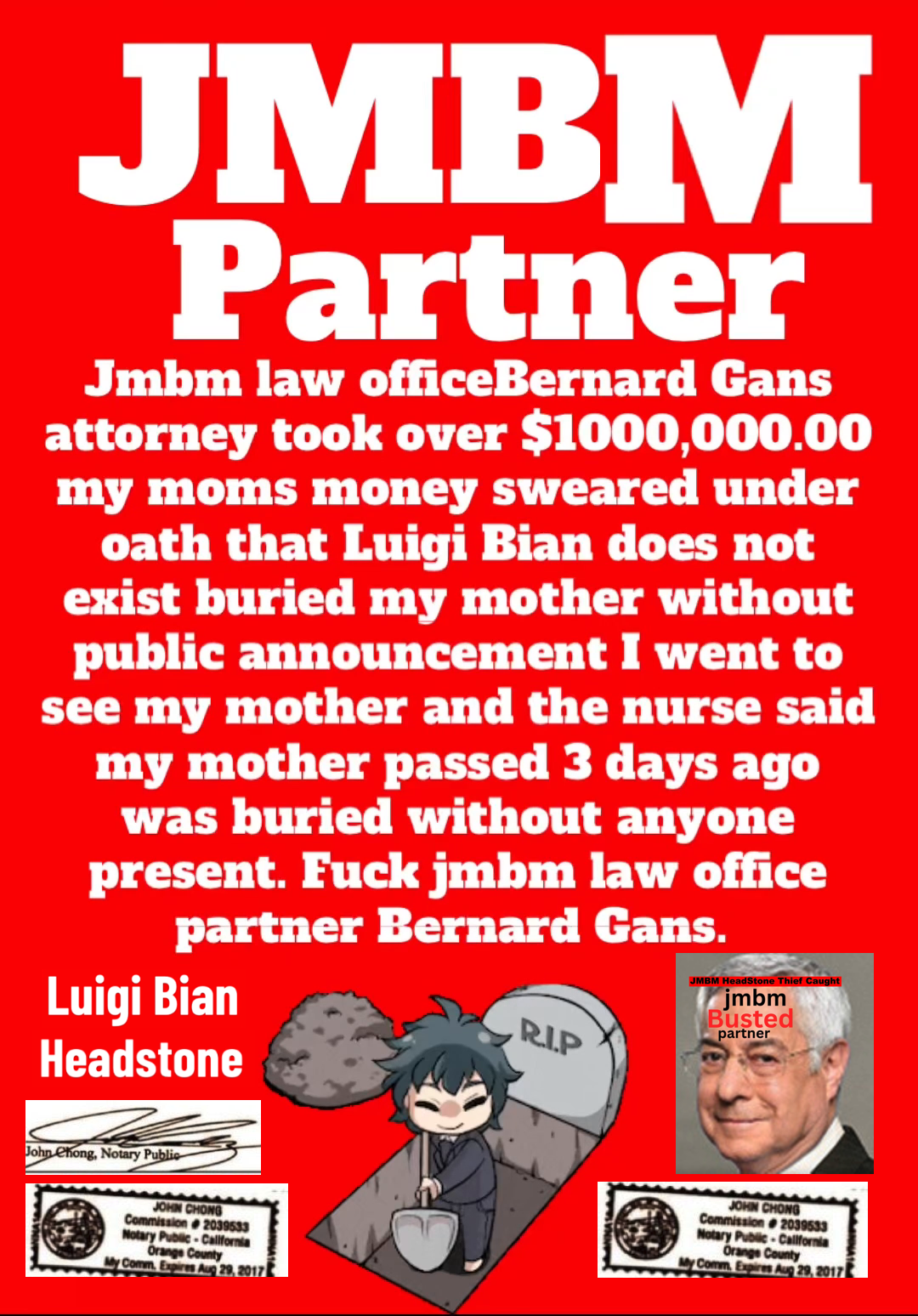 Suing JMBM partner $500,000,000,000.00 Busted criminal attorneys Jeffer Mangels Butler & Mitchell LLP lawyer Bernard Reginald Gans #57068 Bernard Gans Mina Sirkin law group JMBM killed my mom to get her fortune.,